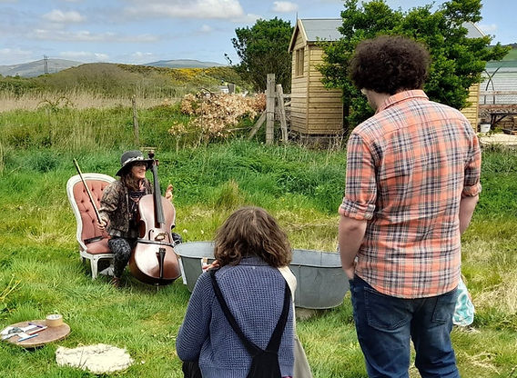 : A cellist and storyteller, Ailsa explored what it means to care for land and each other. Through sound recording, conversations, and folklore, she gathered ideas as people sipped soup during community meals hosted by Eginiad at the Taj Mahal and explored Taliesin’s myth at Coed Lleol’s roundhouse. These shared moments were distilled into a sound potion of renewal.